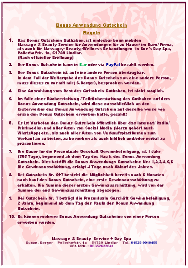 Bonus Gutschein Nr. 3 Gutschein für Anwendungen Wert 3500,- Euro + Bonus 4% Gewinnbeteiligung am Geschäfts- Jahresumsatz